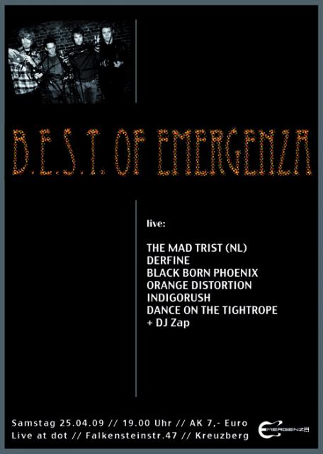 6 Bands am Samstagabend. Mit dabei ist “The Mad Trist“ aus Holland, die bei Emergenza 2008 international den 2. Platz belegt haben! Das wird ein starkes Event mit den besten Emergenza-Bands und so ganz ohne Wettbewerb! Der Kartenvorverkauf läuft: Für 5,-€ bekommt Ihr das Ticket per E-Mail an info@indigorush.de oder direkt bei allen Bandmitgliedern (Abendkasse 7,-€).